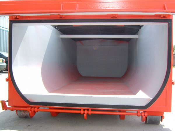 Sealed door containers include an oval shaped dense neoprene sponge rubber fitted into a holding channel, fitted to the end face of the container. The flat inside face of the door is compressed against the seal by means of the ratchet locking mechanism, which forms a ‘water retentive’ seal. Typical applications are: food waste (low acidic), fine dust & slurry. To ensure a continuing seal, care must me taken to clean off any debris before closing the door. For further advice and clarification, please contact technical support.